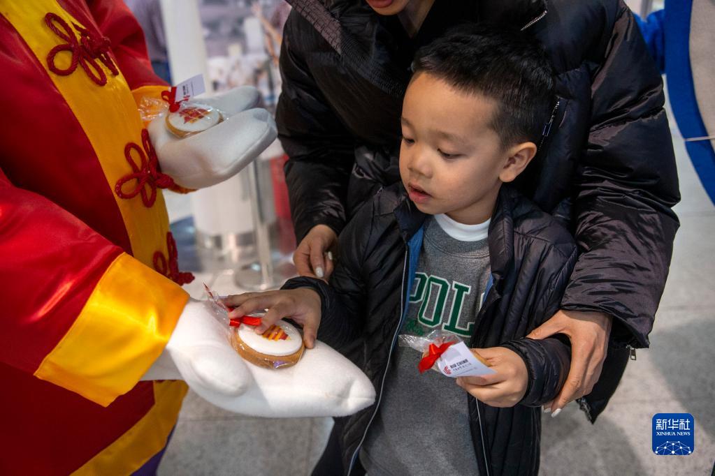 1月26日,在希臘雅典國際機場(chǎng),一名準備搭乘航班前往中國的小乘客從工作人員手中領(lǐng)取小禮物。