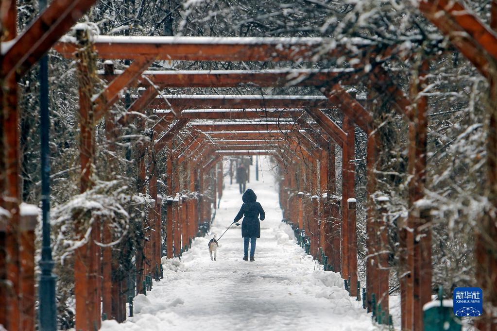 1月28日,一名女子在羅馬尼亞布加勒斯特一處公園的雪地上遛狗。