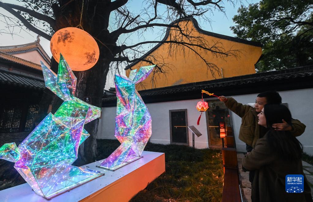 1月29日,在嘉興市秀洲區新塍古鎮小蓬萊公園內,游客在觀(guān)賞“鰲山燈會(huì )”的兔子彩燈。