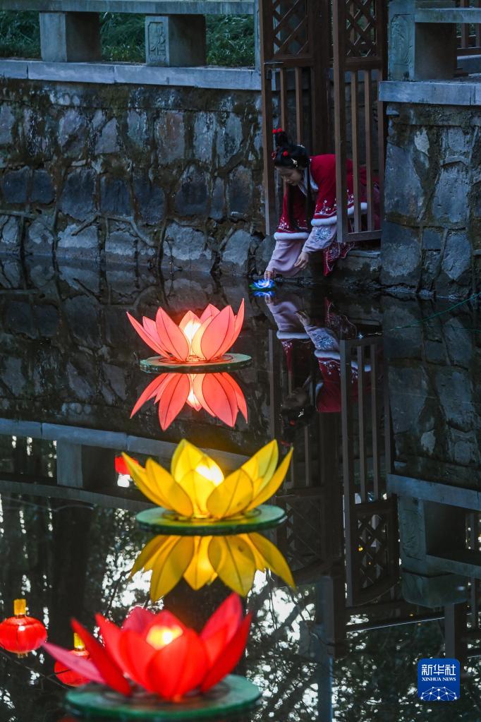 1月29日,在嘉興市秀洲區新塍古鎮小蓬萊公園內,身著(zhù)傳統服飾的游客在“鰲山燈會(huì )”現場(chǎng)放下“心愿燈”。