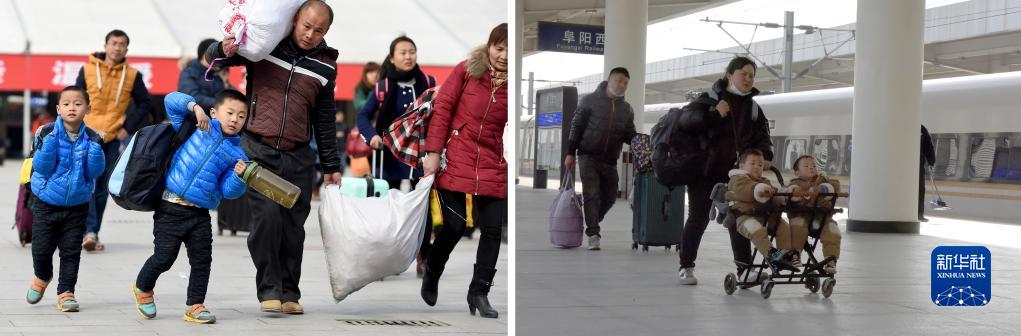 拼版照片:左圖為2016年2月16日,旅客準備進(jìn)入阜陽(yáng)火車(chē)站乘車(chē);右圖為2023年1月27日,在阜陽(yáng)西站內,兩名旅客帶著(zhù)孩子準備登車(chē)。