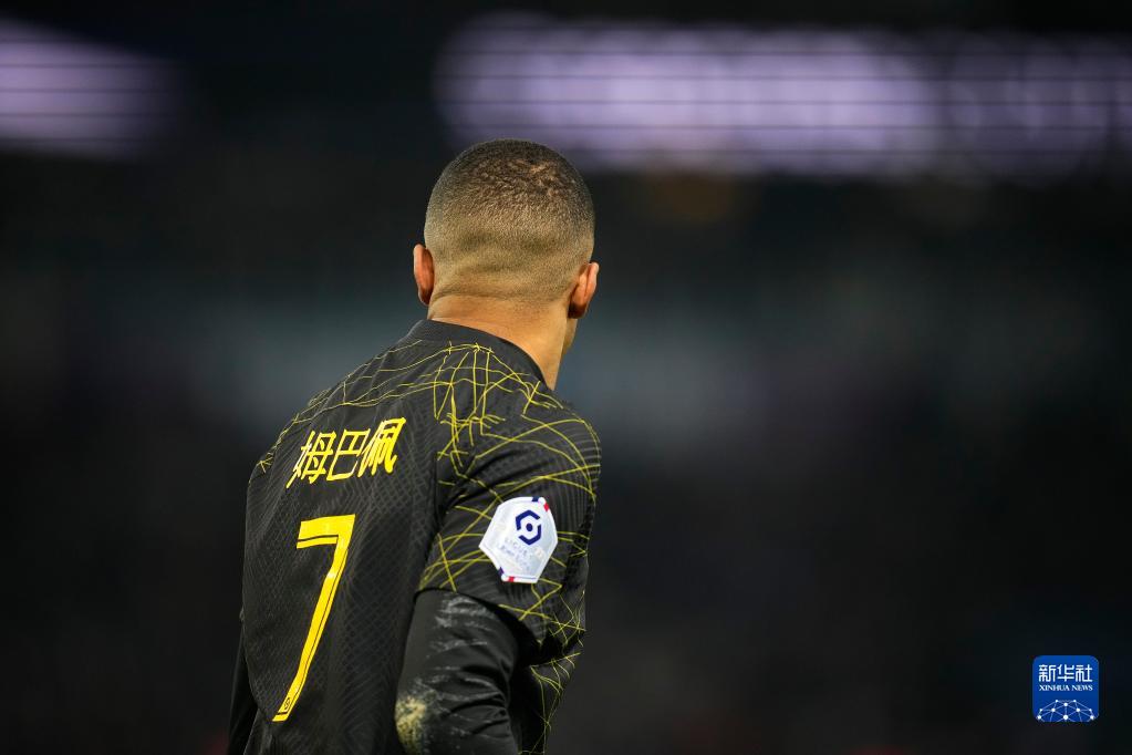 1月29日,在法國巴黎王子公園球場(chǎng),巴黎圣日耳曼隊球員姆巴佩身著(zhù)印有中文名字的隊服。