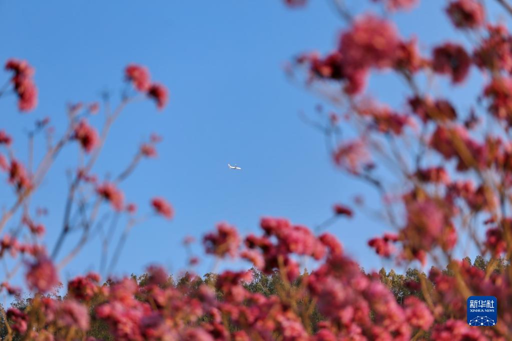 1月29日,在江門(mén)市新會(huì )區大澤鎮山頭坪,一架飛機在花海上空飛過(guò)。