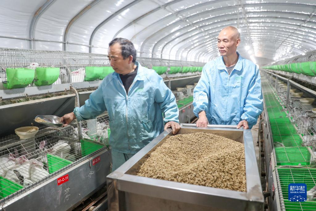 1月31日,華鎣市永興鎮馬架坪村肉兔飼養基地的工作人員在給肉兔添加飼料。