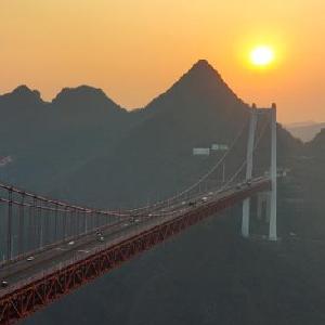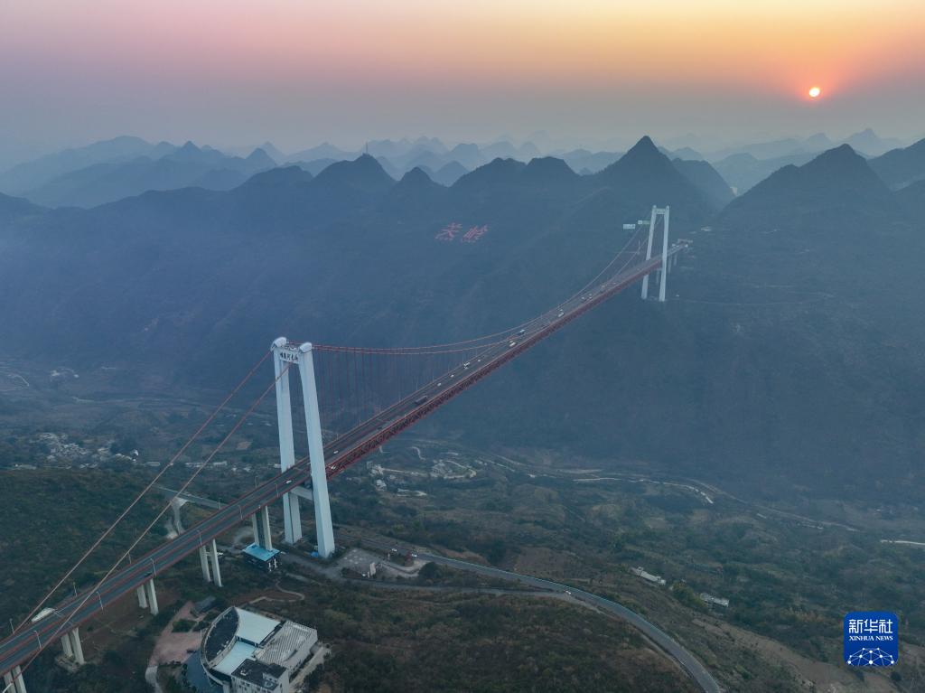 當日,貴州壩陵河大橋沐浴在夕陽(yáng)余暉下,美不勝收。