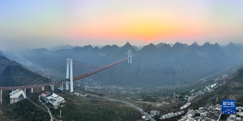 當日,貴州壩陵河大橋沐浴在夕陽(yáng)余暉下,美不勝收。