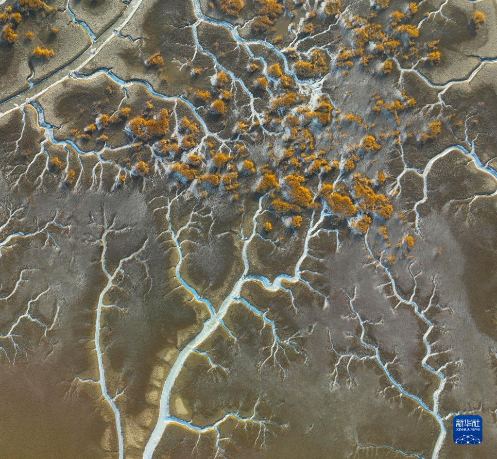 近日,在遼寧盤(pán)錦遼河口濕地,海水在潮汐作用下涌入遼河口濕地的潮溝,并凝結成冰,從高空看去,宛若蜿蜒曲折、形態(tài)各異的“冰脈”。