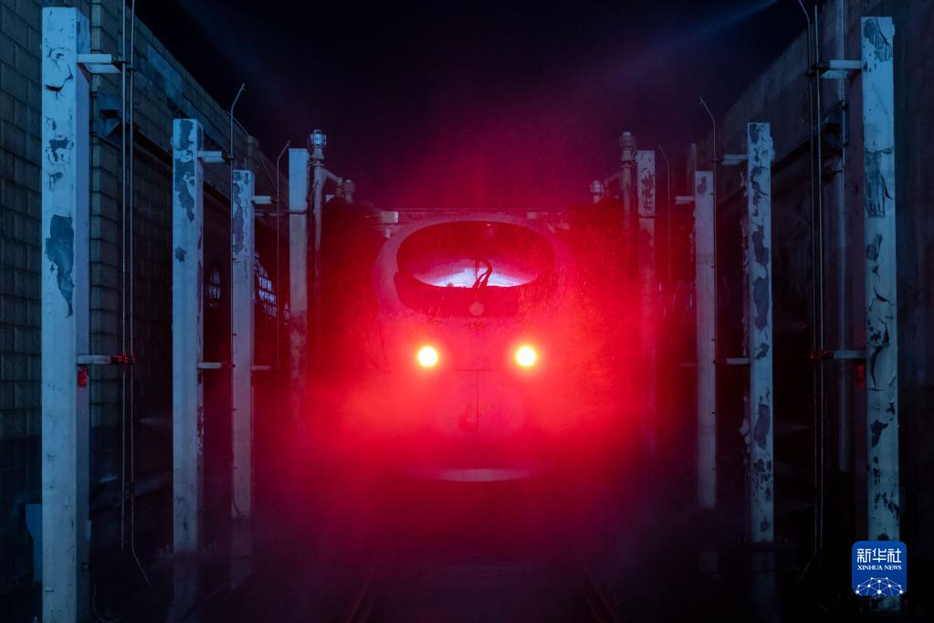 2月1日凌晨0時(shí)許,在南翔動(dòng)車(chē)運用所,DJ7716次高鐵確認列車(chē)在入庫前進(jìn)行機械化清洗作業(yè)。