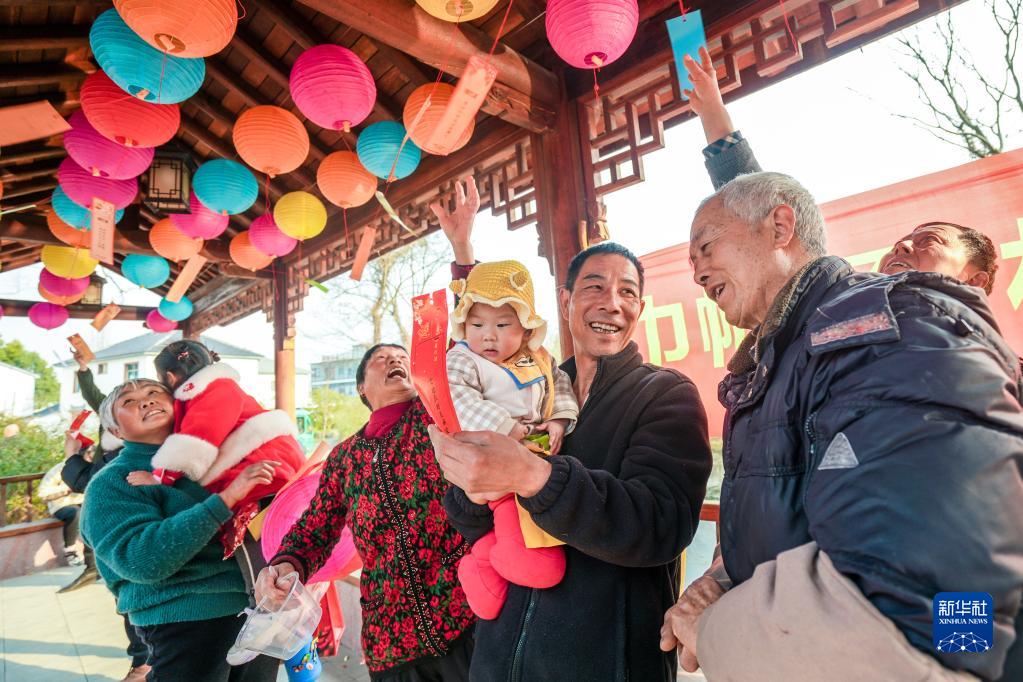 2月2日,村民在浙江省湖州市長(cháng)興縣煤山鎮仰峰村文化禮堂外賞花燈、猜燈謎。