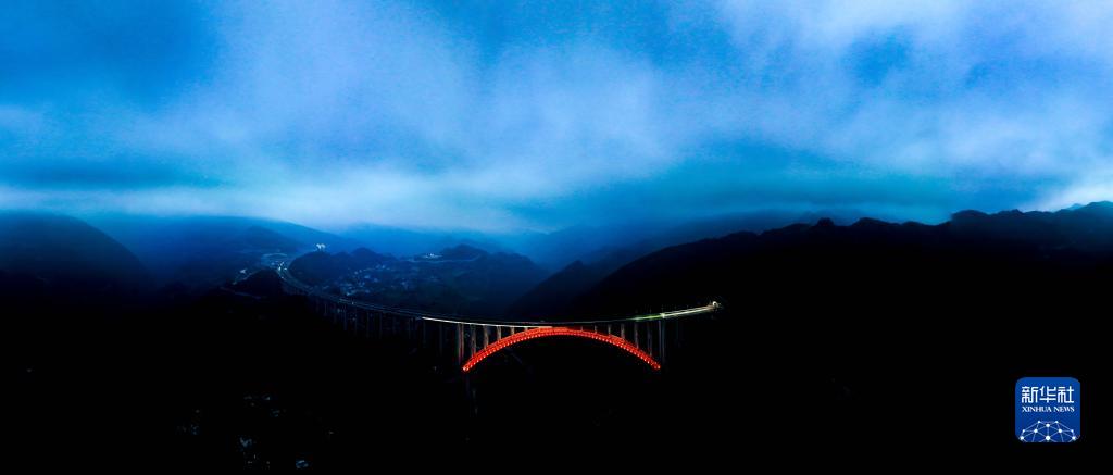 這是2月2日在貴州省遵義市拍攝的夜幕下的大發(fā)渠特大橋(無(wú)人機全景照片)。