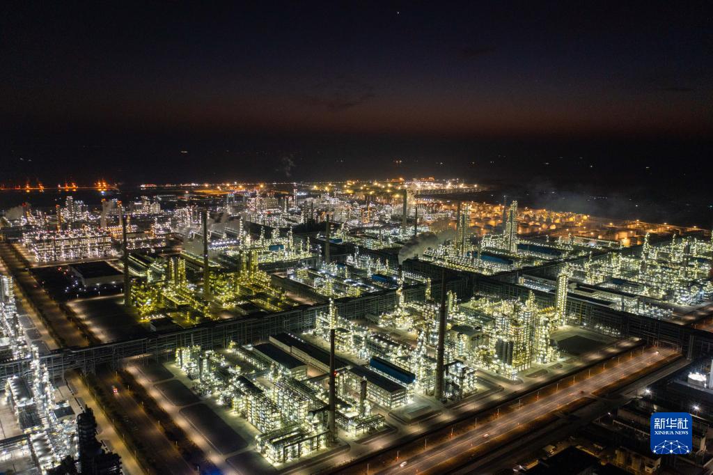 空中俯瞰燈火通明的舟山綠色石化基地(1月31日攝,無(wú)人機照片)。2022年石化基地完成投資395.9億元,累計加工原油3702.76萬(wàn)噸,實(shí)現產(chǎn)值2314億元。春節期間該基地不停工,一直處于“抓訂單、忙生產(chǎn)”的狀態(tài)。