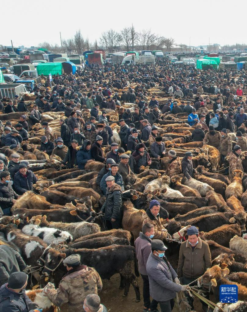 2月1日,位于新疆伊寧縣愉群翁回族鄉阿勒推村的新疆創(chuàng )錦黃公農產(chǎn)品交易市場(chǎng)開(kāi)市,市場(chǎng)商品琳瑯滿(mǎn)目,牛羊馬交易火爆。