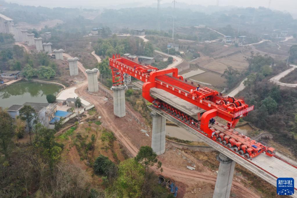 2月4日,在渝昆高鐵重慶段建設施工現場(chǎng),架橋機在進(jìn)行830噸大型箱梁架設作業(yè)(無(wú)人機照片)。