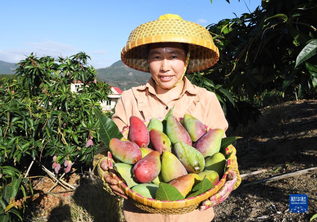 海南省三亞市育才生態(tài)區芒果園的工人楊秀英展示采摘的芒果(2月1日攝)。