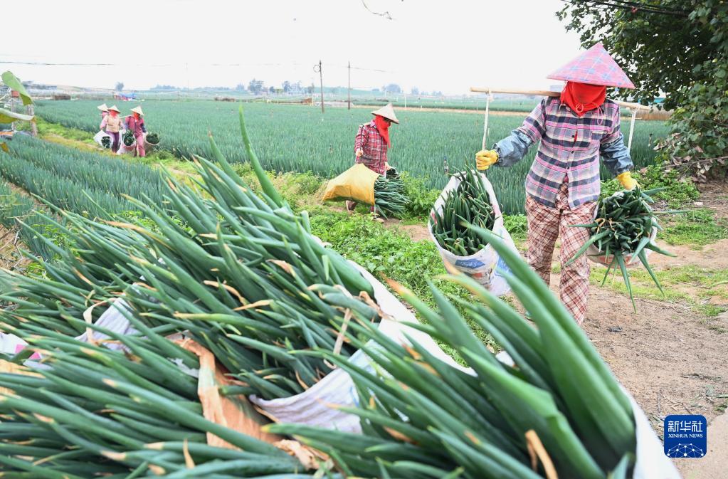 2月4日,在漳浦縣六鰲鎮的一處農田,村民挑運采收的大蔥。