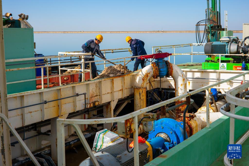 2月2日,賀連福(右)與同事將水采船上清理出的鹽塊轉移到工作船上清運走。
