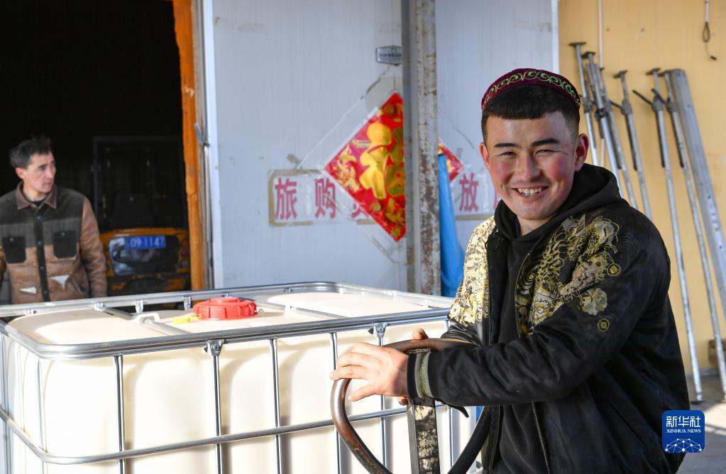 工人在新疆塔城地區一家外貿企業(yè)貨場(chǎng)搬運即將出口哈薩克斯坦的密封漆(2月4日攝)。