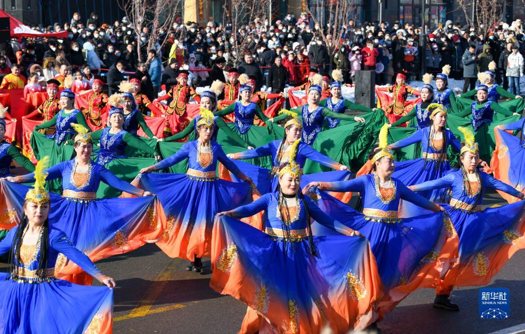 2月5日,新疆塔城地區額敏縣群眾在表演社火。