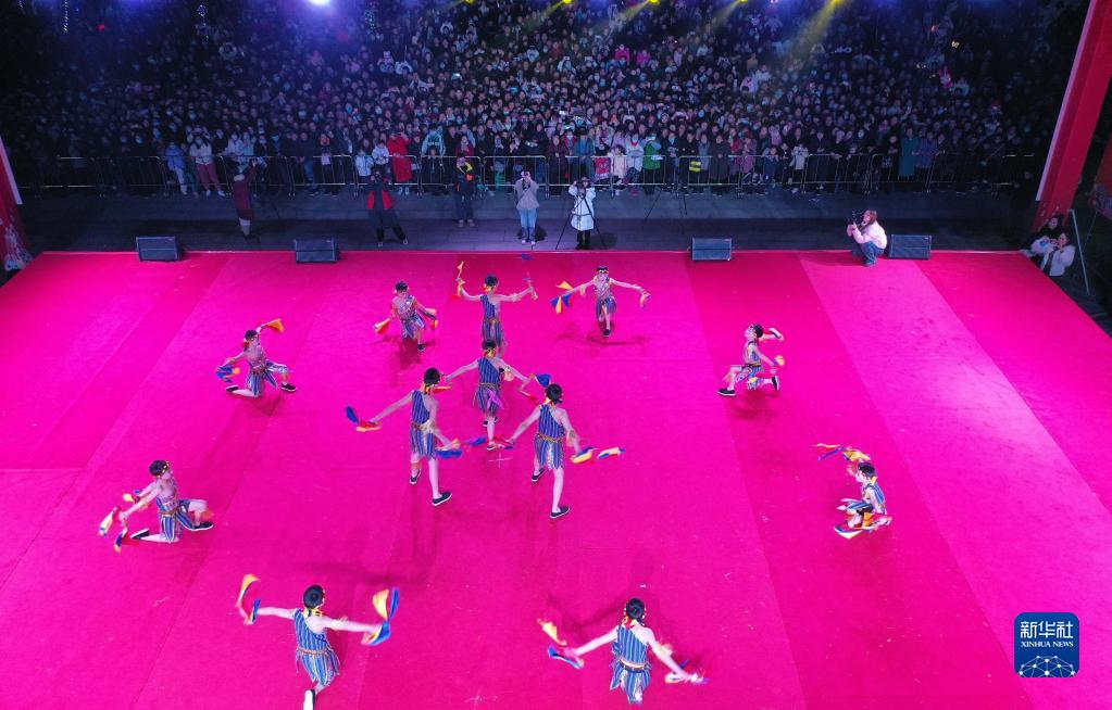 2月5日,人們在湖北省宣恩縣人民廣場(chǎng)觀(guān)看民俗表演(無(wú)人機照片)。