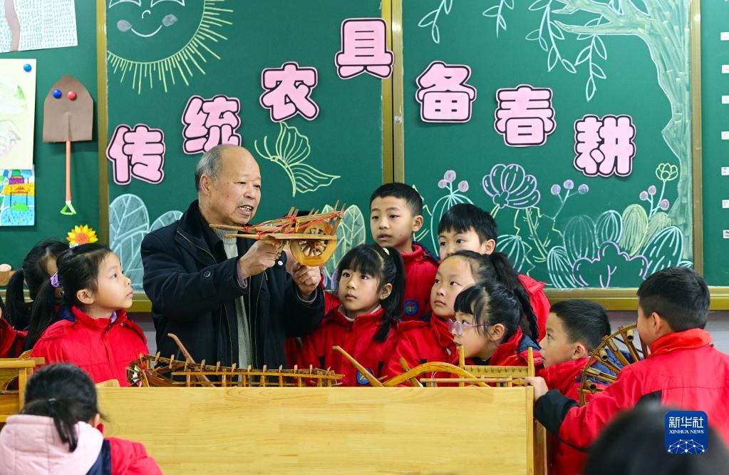 2月6日,江西省宜春市萬(wàn)載縣第五小學(xué),傳統農耕微縮農具制作老師郭西燦給學(xué)生介紹傳統農耕文化。