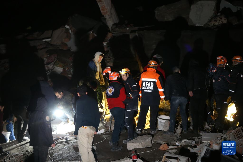 2月6日,救援人員在土耳其南部地震重災區卡赫拉曼馬拉什省帕扎爾哲克倒塌的建筑中搜尋幸存者。