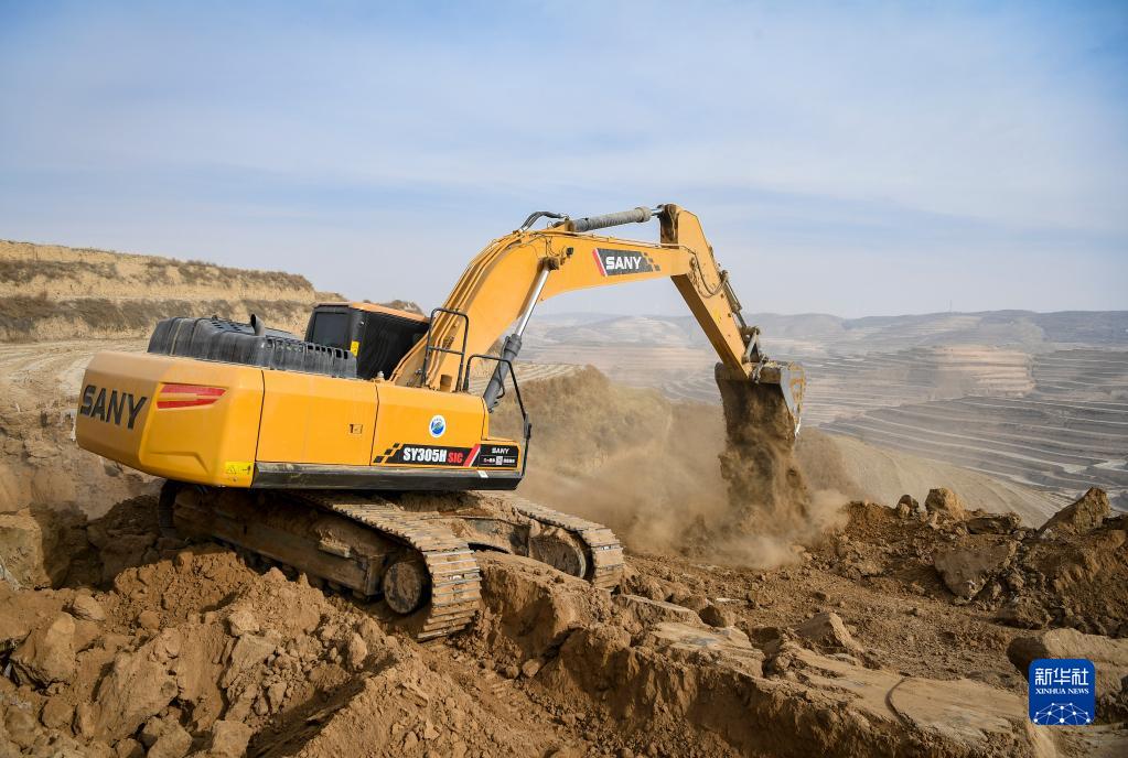 2月7日,工人操作挖掘機在寧夏固原市西吉縣硝河鄉蘇溝村平整土地。