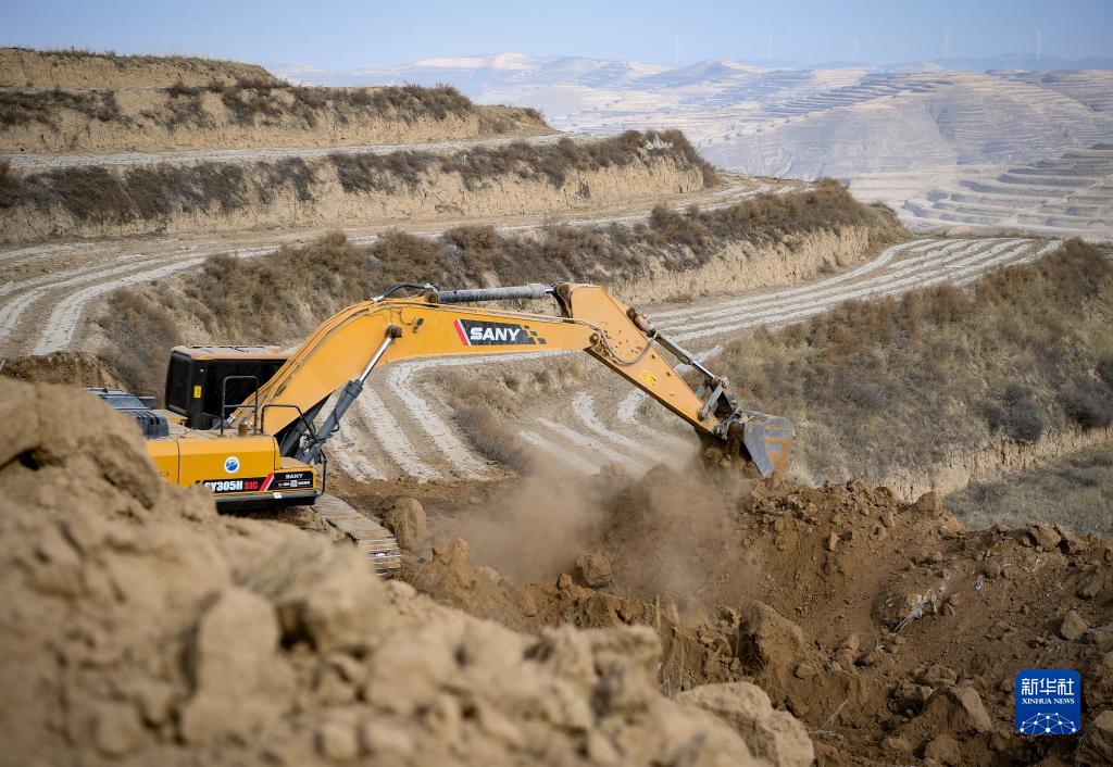 2月7日,工人操作挖掘機在寧夏固原市西吉縣硝河鄉蘇溝村平整土地。