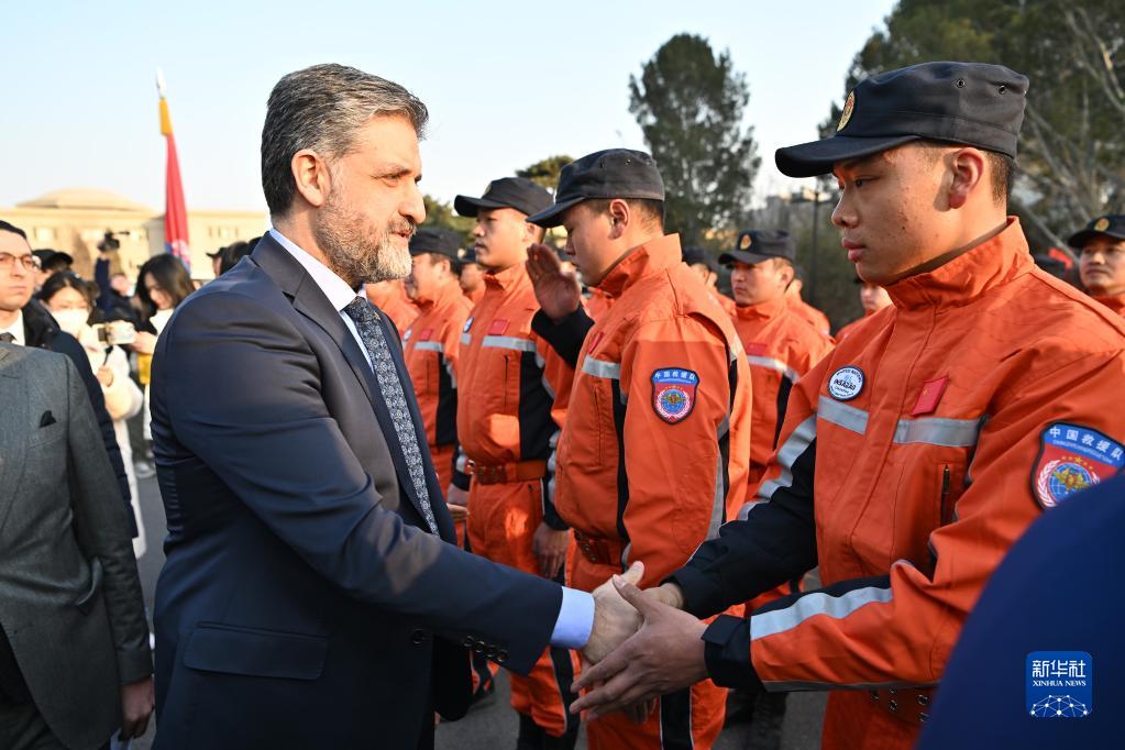這是土耳其駐華大使約南與中國救援隊隊員握手(2月7日攝)。