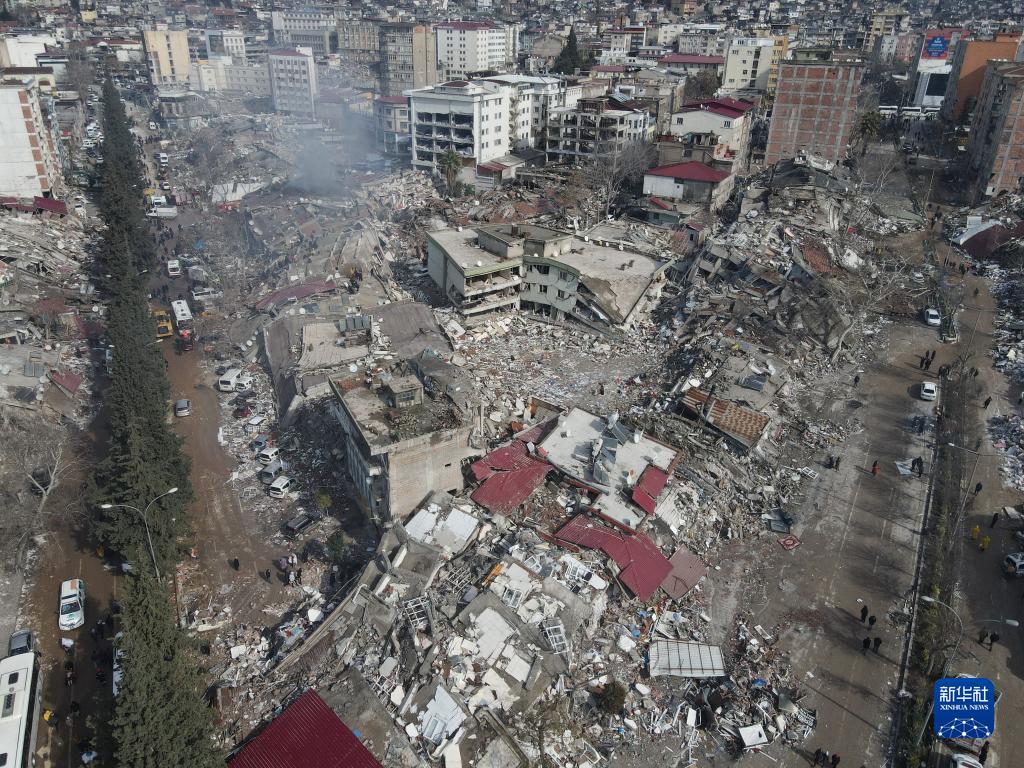 這是2月7日在土耳其南部卡赫拉曼馬拉什市市中心拍攝的震后景象(無(wú)人機照片)??ê绽R拉什市是本次地震重災區卡赫拉曼馬拉什省省會(huì ),是遭受地震破壞最為嚴重的城市之一。