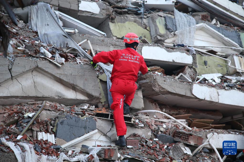 2月7日,在土耳其南部卡赫拉曼馬拉什市市中心,救援人員在搜救??ê绽R拉什市是本次地震重災區卡赫拉曼馬拉什省省會(huì ),是遭受地震破壞最為嚴重的城市之一。