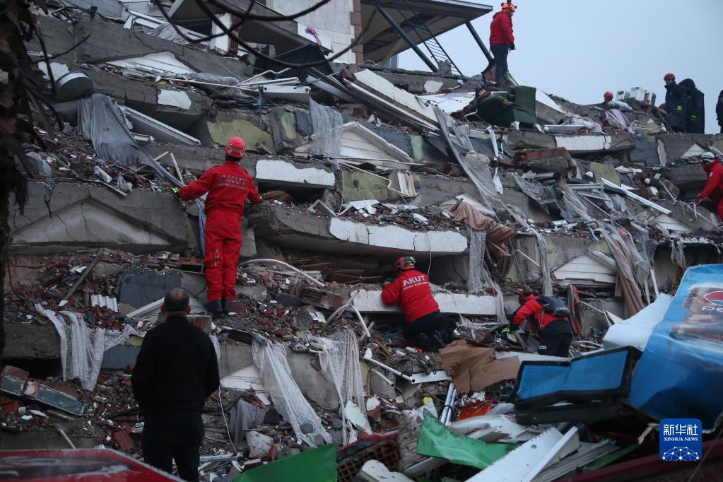 2月7日,在土耳其南部卡赫拉曼馬拉什市市中心,救援人員在搜救??ê绽R拉什市是本次地震重災區卡赫拉曼馬拉什省省會(huì ),是遭受地震破壞最為嚴重的城市之一。
