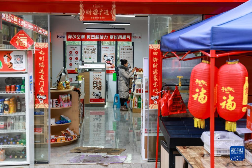 團結村村民趙荷花在自家經(jīng)營(yíng)的超市內擺放貨物(2月2日攝)。