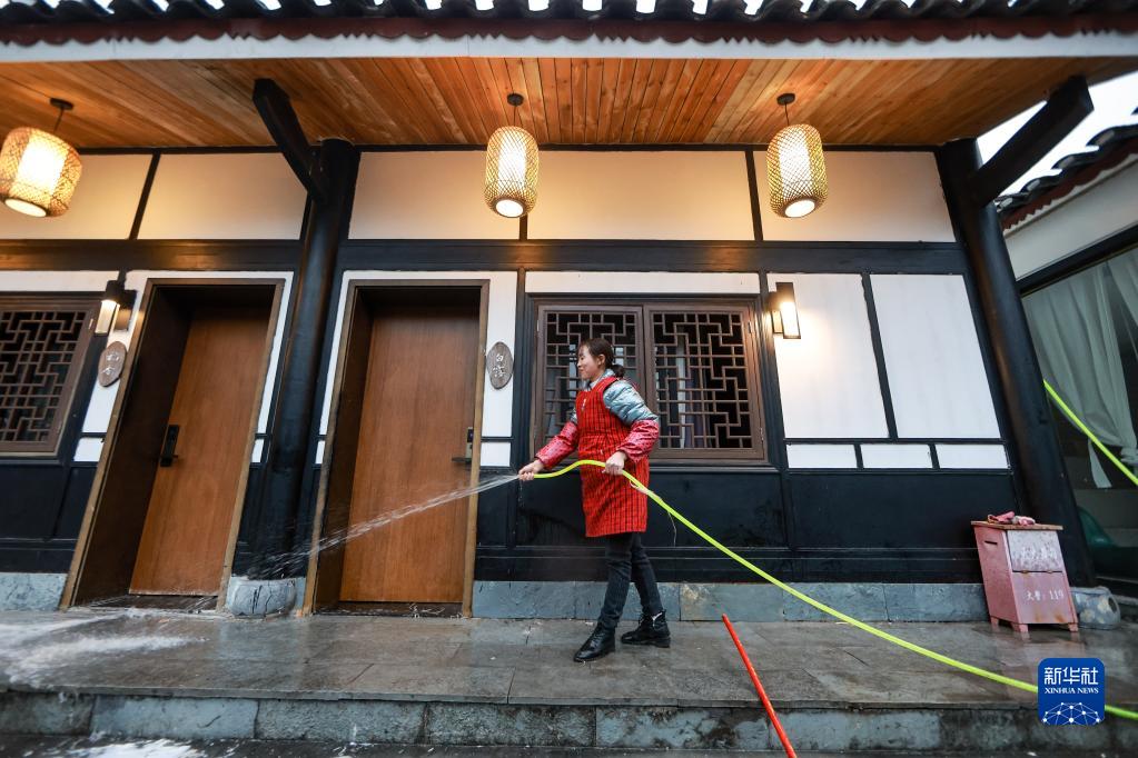 團結村村民在打掃民宿的衛生(2月2日攝)。仁遵高速通車(chē)后,大量游客來(lái)到團結村觀(guān)光旅游。