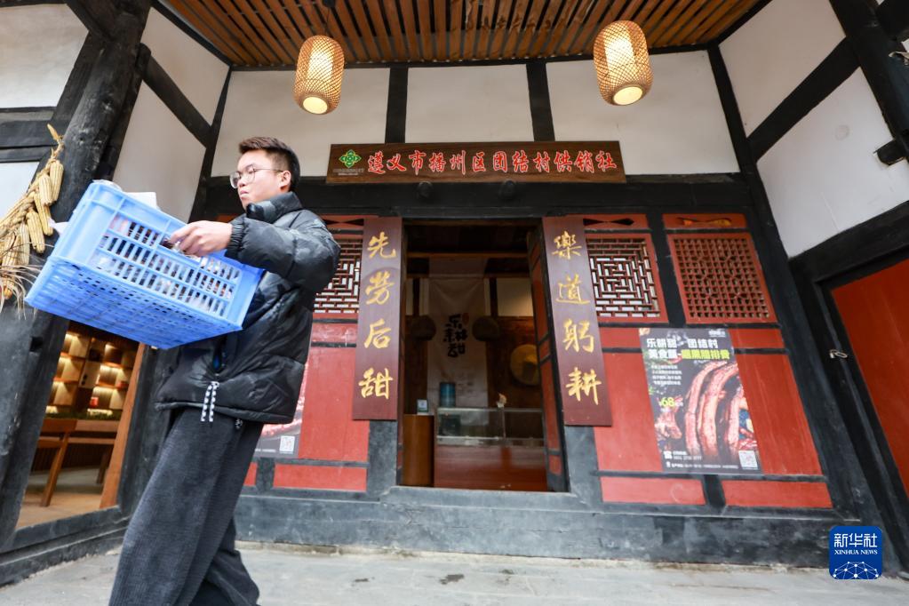 村民在團結村供銷(xiāo)社前搬運貨物(2月2日攝)。仁遵高速通車(chē)后,大量游客來(lái)到團結村觀(guān)光旅游。