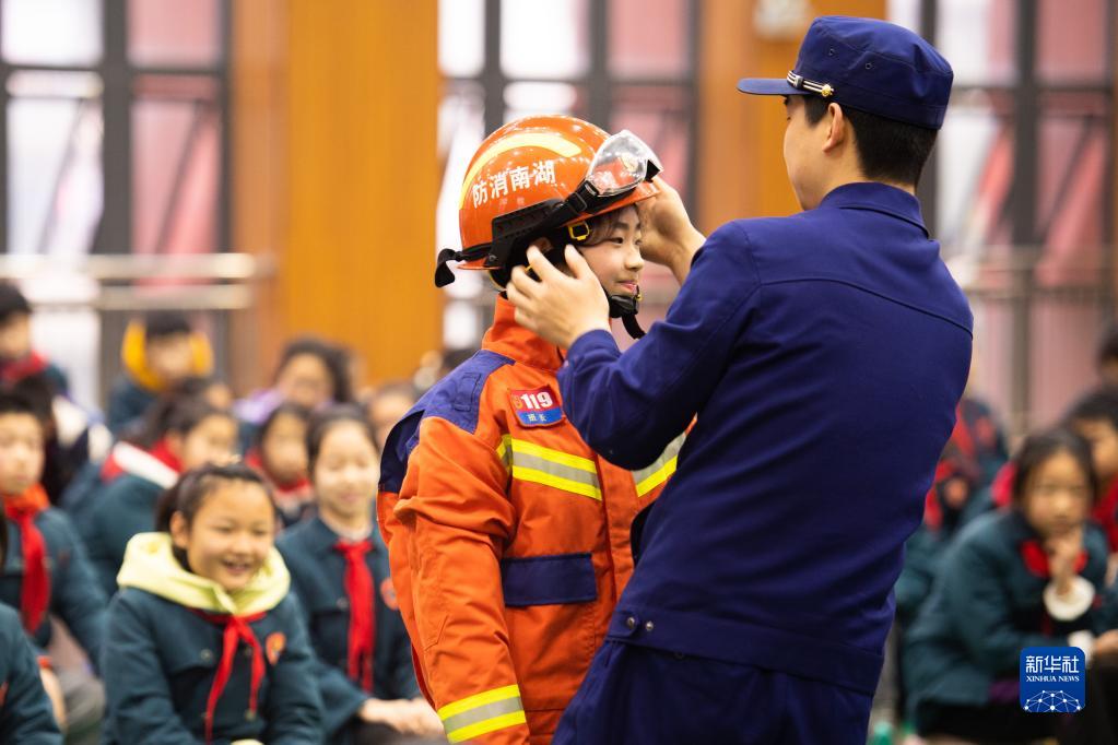 2月8日,在常德市武陵區第一小學(xué)體育館,學(xué)生體驗穿著(zhù)消防救援服。