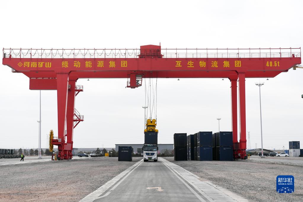 2月8日,新能源重卡在鄂爾多斯市東勝區綠動(dòng)萬(wàn)利新能源智慧陸港內裝運集裝箱。