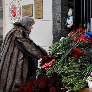 2月8日,莫斯科市民在土耳其駐俄羅斯大使館外獻花悼念地震遇難者。