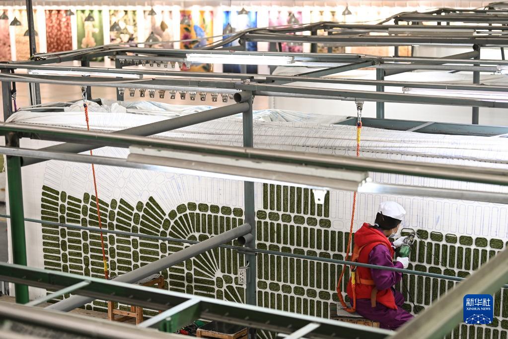 一位女工在圣源地毯集團有限公司生產(chǎn)車(chē)間使用槍刺工藝制作地毯(2月1日攝)。