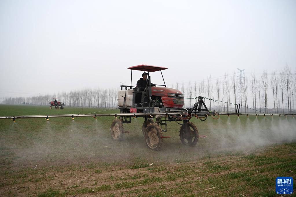 2月8日,在河南省沁陽(yáng)市西萬(wàn)鎮邘邰村,農民駕駛農機在麥田作業(yè)。