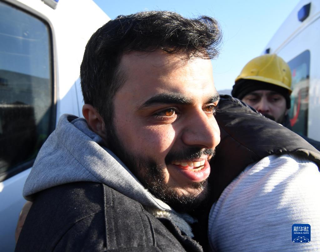 2月9日,在土耳其哈塔伊省安塔基亞市,救出的女性幸存者的親人擁抱致意。