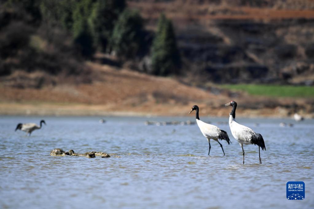 2月10日,黑頸鶴在貴州草海國家級自然保護區覓食。