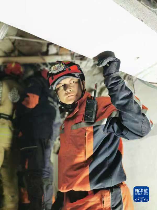 2月9日晚,在土耳其哈塔伊省安塔基亞市,一名中國救援隊隊員在一棟倒塌的7層樓房廢墟中參與救援(手機拍攝)。