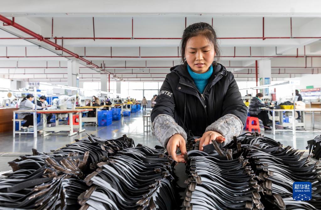 2月9日,員工在貴州黔西炬凱鞋業(yè)有限公司車(chē)間加工鞋面。