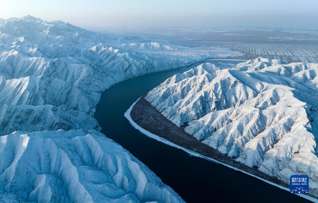 大雪過(guò)后,寧夏青銅峽黃河大峽谷銀裝素裹,黃河從峽谷間流過(guò),美如畫(huà)卷。新華社發(fā)(祁瀛濤攝)
