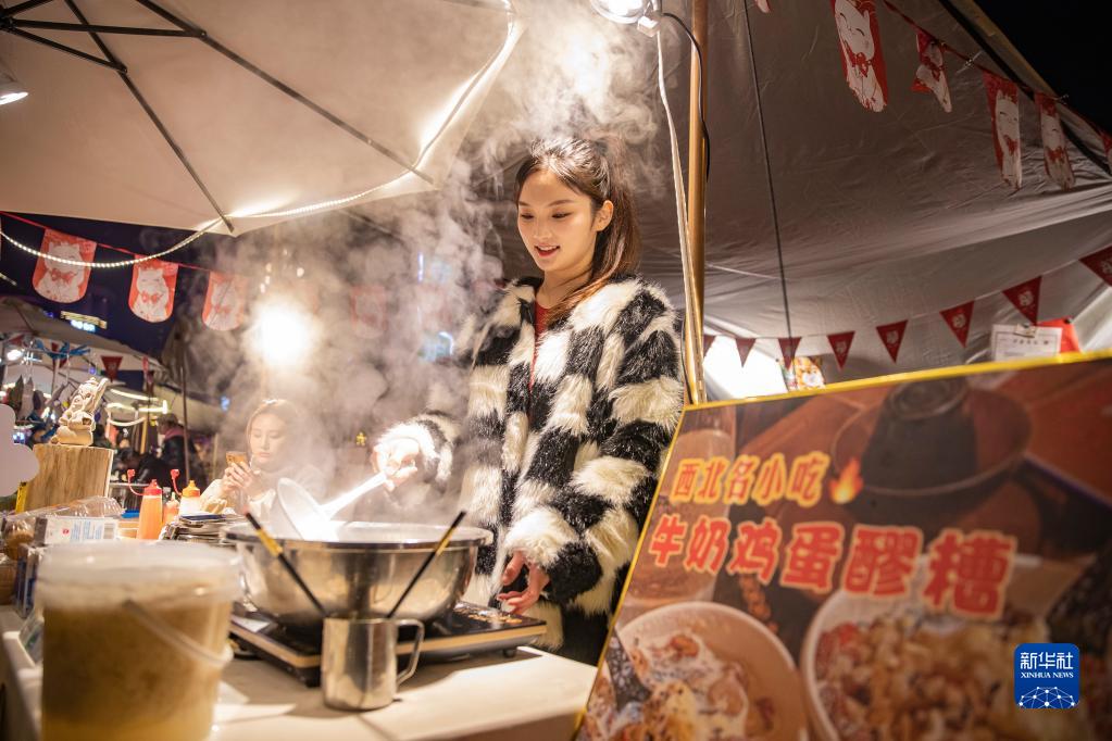 2月9日晚,在位于重慶市南岸區南濱路旁的小熊集市,手工湯圓店主陳苗在為游客煮制手工湯圓。