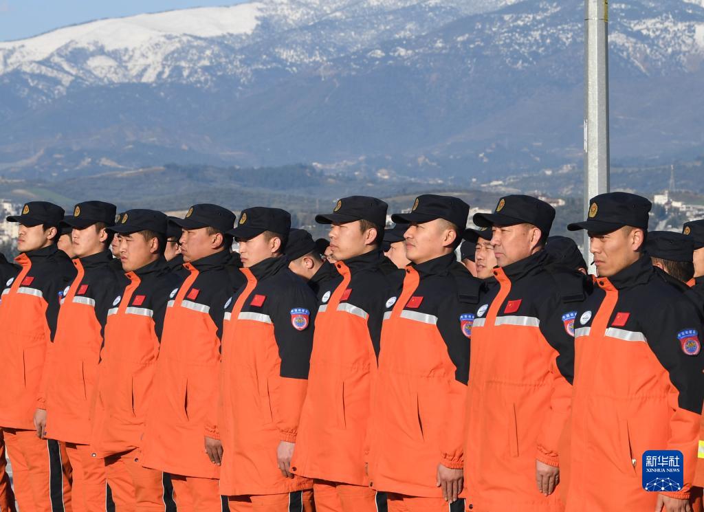 2月10日,中國救援隊隊員在土耳其哈塔伊省安塔基亞市的駐扎營(yíng)區參加升旗儀式。