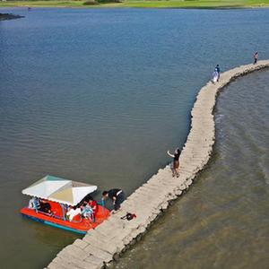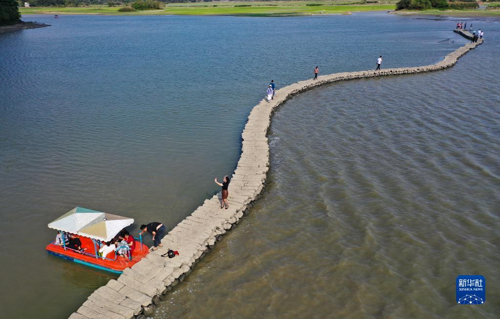 國倉村石橋位于??谑协偵絽^龍塘鎮,距今有500余年歷史,因形狀彎曲似蛇,被當地人稱(chēng)為“蛇橋”。蜿蜒的石橋水漲則沒(méi),水退則顯,一年只在初春至初夏時(shí)節露出水面。