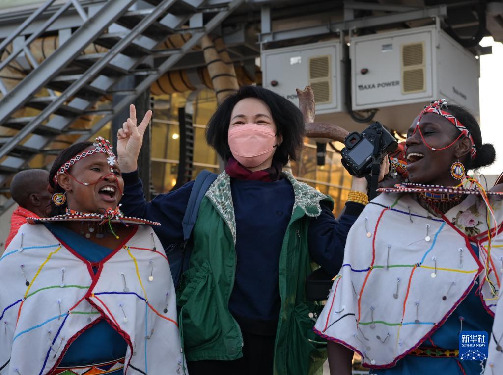 2月11日,在肯尼亞首都內羅畢喬莫·肯雅塔國際機場(chǎng),中國游客和肯尼亞演員合影。