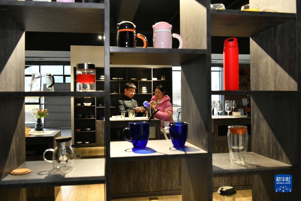 2月11日,客商在河北省河間市一家工藝玻璃制品生產(chǎn)企業(yè)展廳內參觀(guān)。