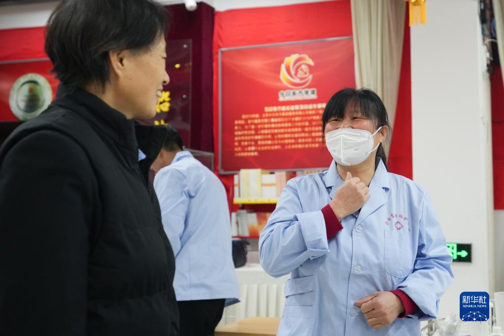 薛四四(右)在北京市今日東方家政服務(wù)公司的護工崗前培訓上與老師交流(2月8日攝)。